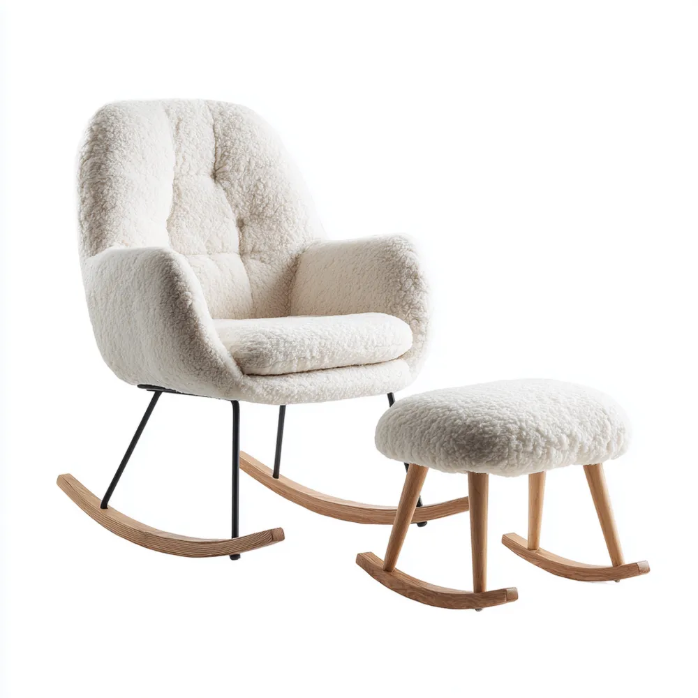 Descrizione del prodottoQuesta sedia a dondolo con poggiapiedi aggiunge un tocco di eleganza moderna al tuo spazio. Con il suo design confortevole e il rivestimento in pelliccia sintetica bianca, è perfetta per momenti di relax.